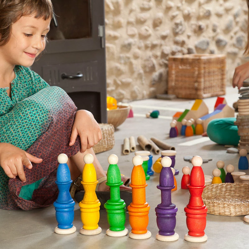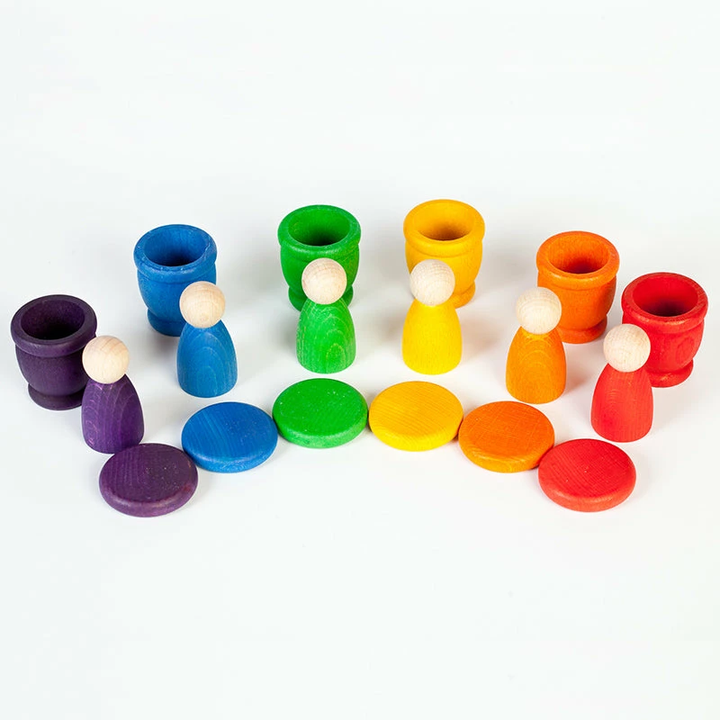 There are 18 rainbow coloured pieces in this magnificent set. There are 6 nins, 6 mates and 6 coins in rainbow colours included. The nins are 6cm in height and the coins and mates are 4.5cm in diameter. Fill and empty, move, sort and stack. One coin can serve to cover a mate and also hide its contents and make them disappear. Fun and simple games that help to develop, hand eye coordination, imagination, math skills and so much more.
