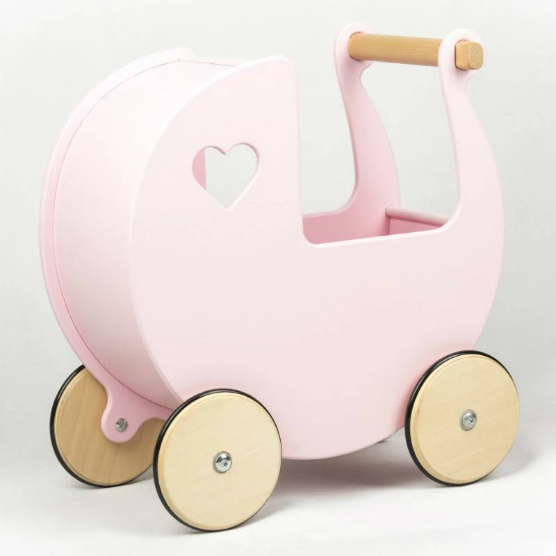 The Moover Doll Pram is the perfect play room addition, mixing classic and modern styling in the one design. The pram is suitable for both large and small dolls with a big storage compartment that can be used for transporting a number of soft and cuddly friends around the house. Imitating grown up behaviour through pretend play is a great way for children to learn and develop their empathetic and nurturing qualities as they care for their dolls and teddies just as adults care for them. This high quality wooden pram is fitted with wooden wheels and rubber TPE types.